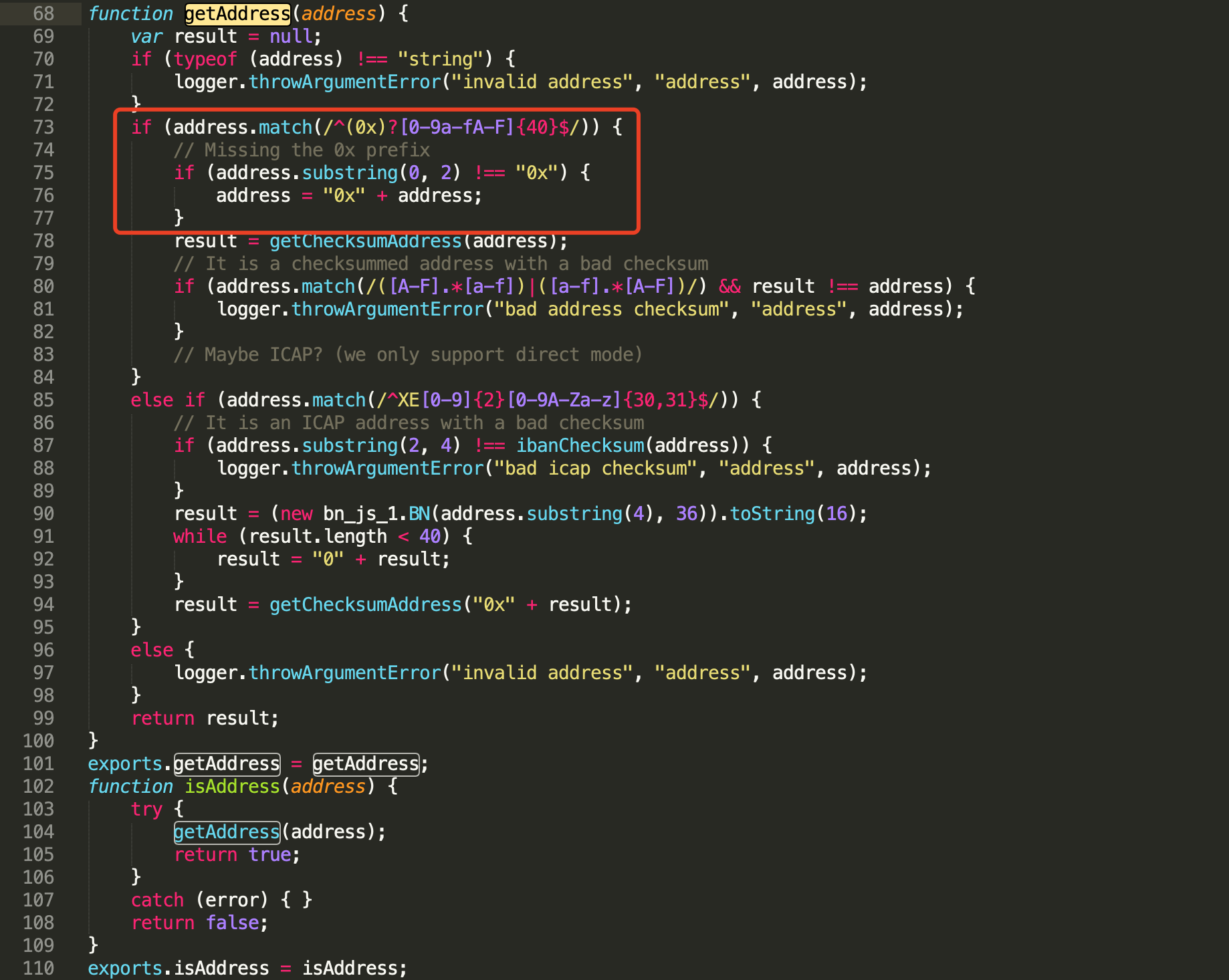 我们来看@ethersproject/address中的getAddress函数