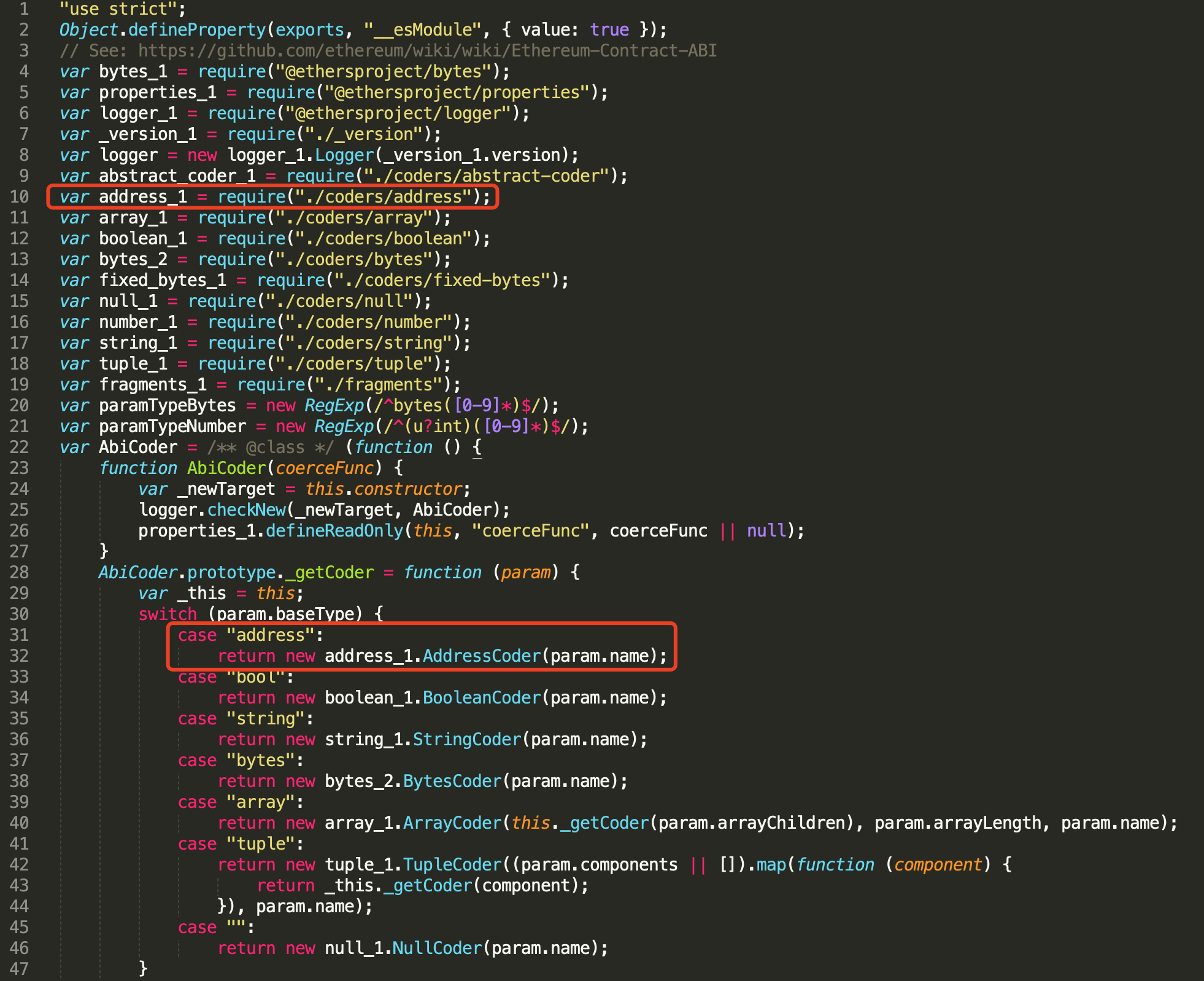 在_getCoder函数中可以看到会根据参数的变量类型返回相应的编码器,其中针对地址类型的编码器AddressCoder位于./coders/address包中