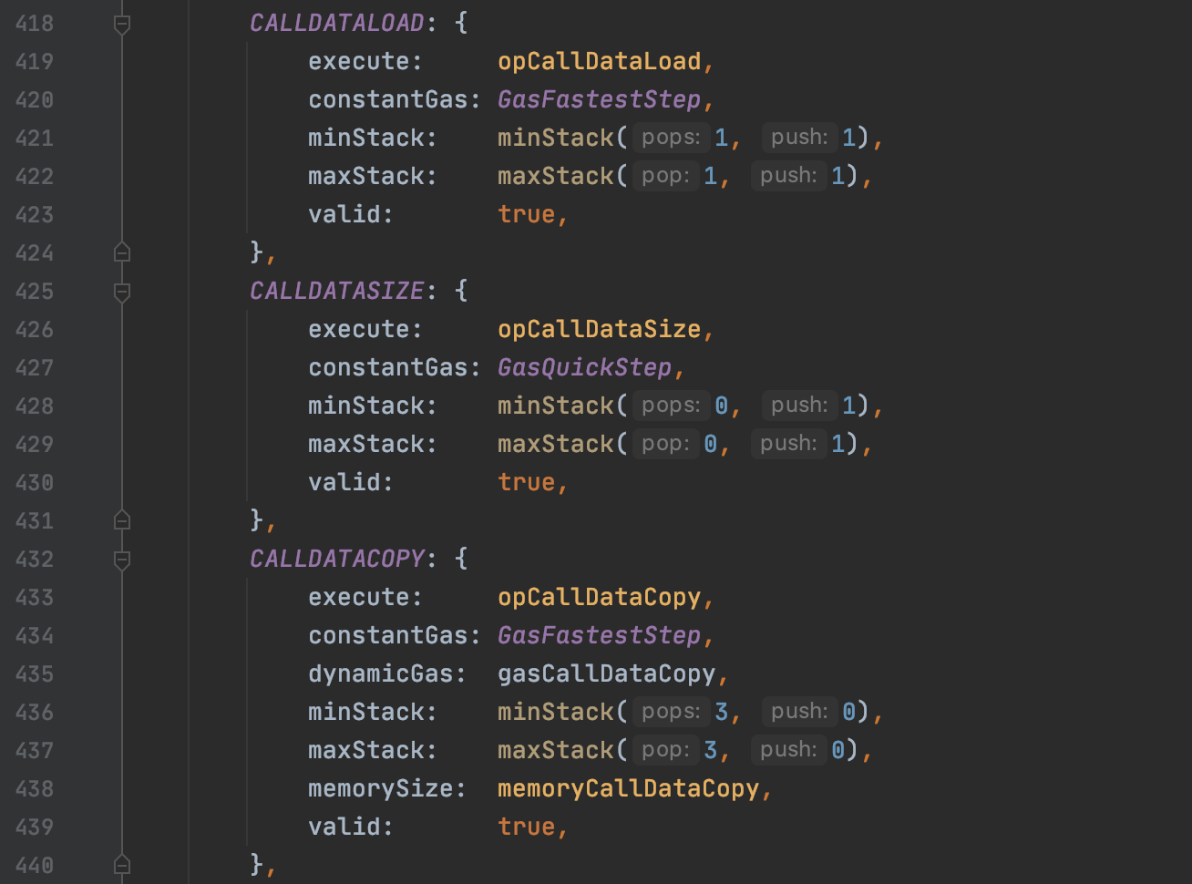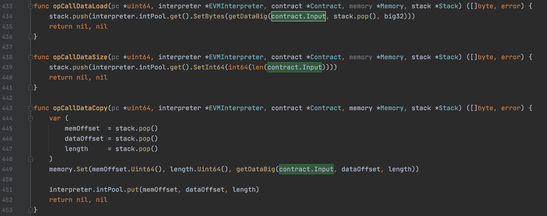 我们重点关注opCallDataLoad函数是如何处理input中的参数入栈的