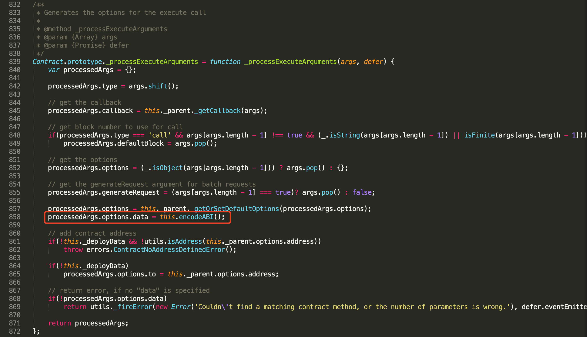 _processExecuteArguments函数主要构造调用的options,其中会调用this.encodeABI赋予options.data