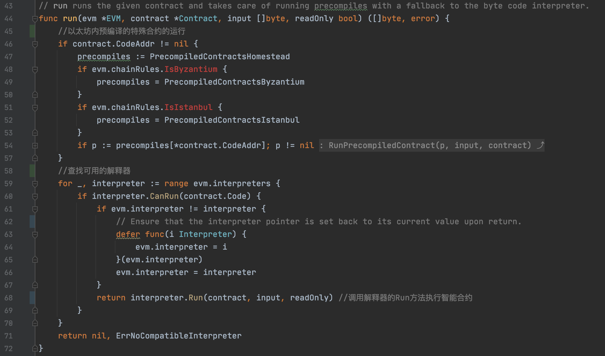 run函数前半段是判断是否是以太坊内置预编译的特殊合约,有单独的运行方式