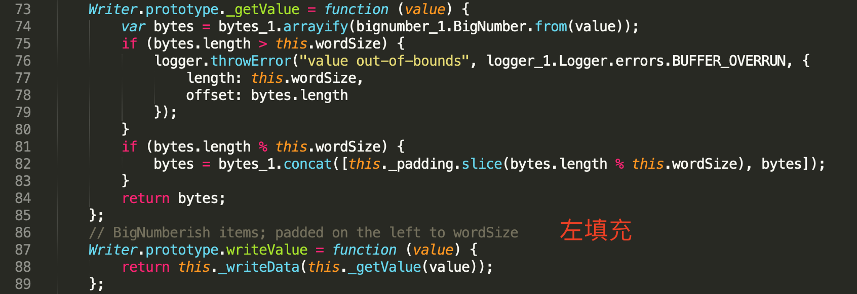 另外除了getAddress函数中对地址形式的校验,encode函数在调用address_1.getAddress()之后,紧接着调用了writer.writeValue,而在writeValue函数中还会对地址参数进行左填充