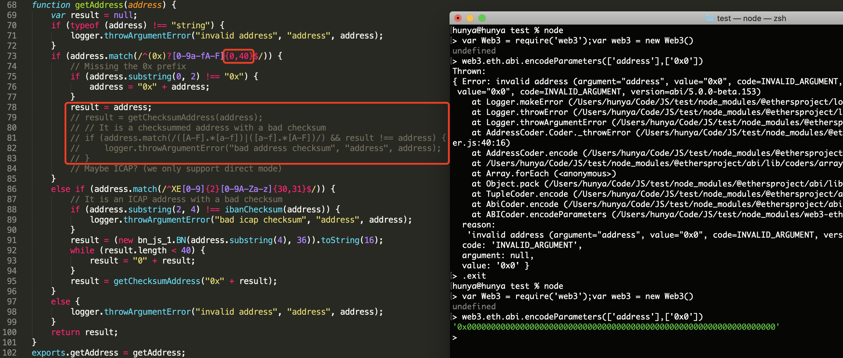 很明显,getAddress函数中会先对地址的形式做校验,正则中的{40}必须匹配到40位长度,匹配之后还会计算校验和,否则就会在上层encode中的try...catch语句中抛出错误Error: invalid address