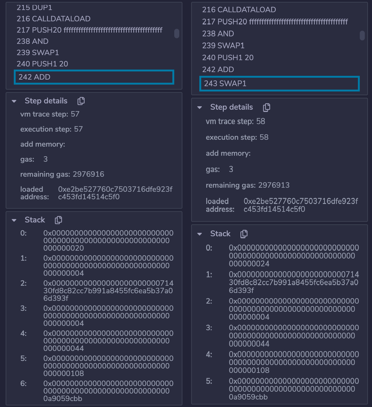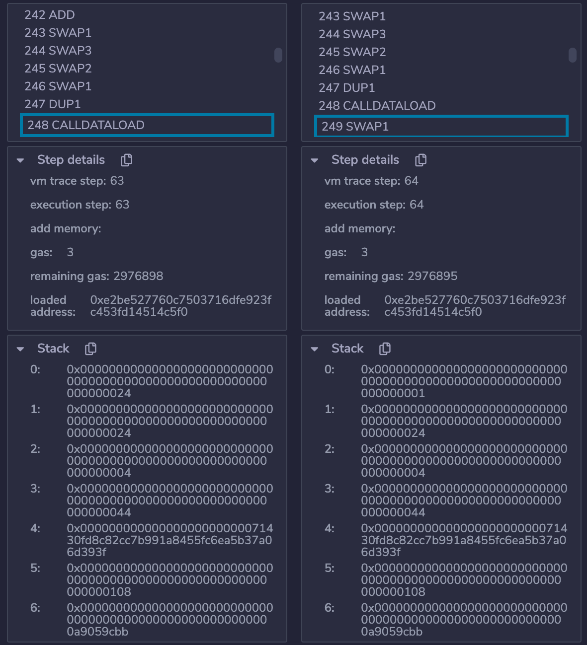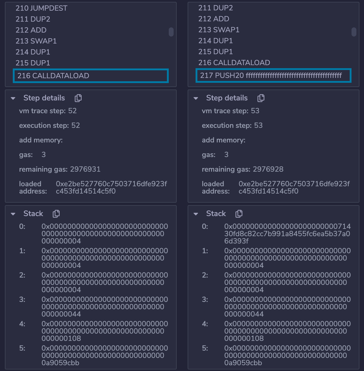 CALLDATALOAD取栈顶0x04为起始索引截取input32字节数据0x00000000000000000000000071430fd8c82cc7b991a8455fc6ea5b37a06d393f,即为参数to