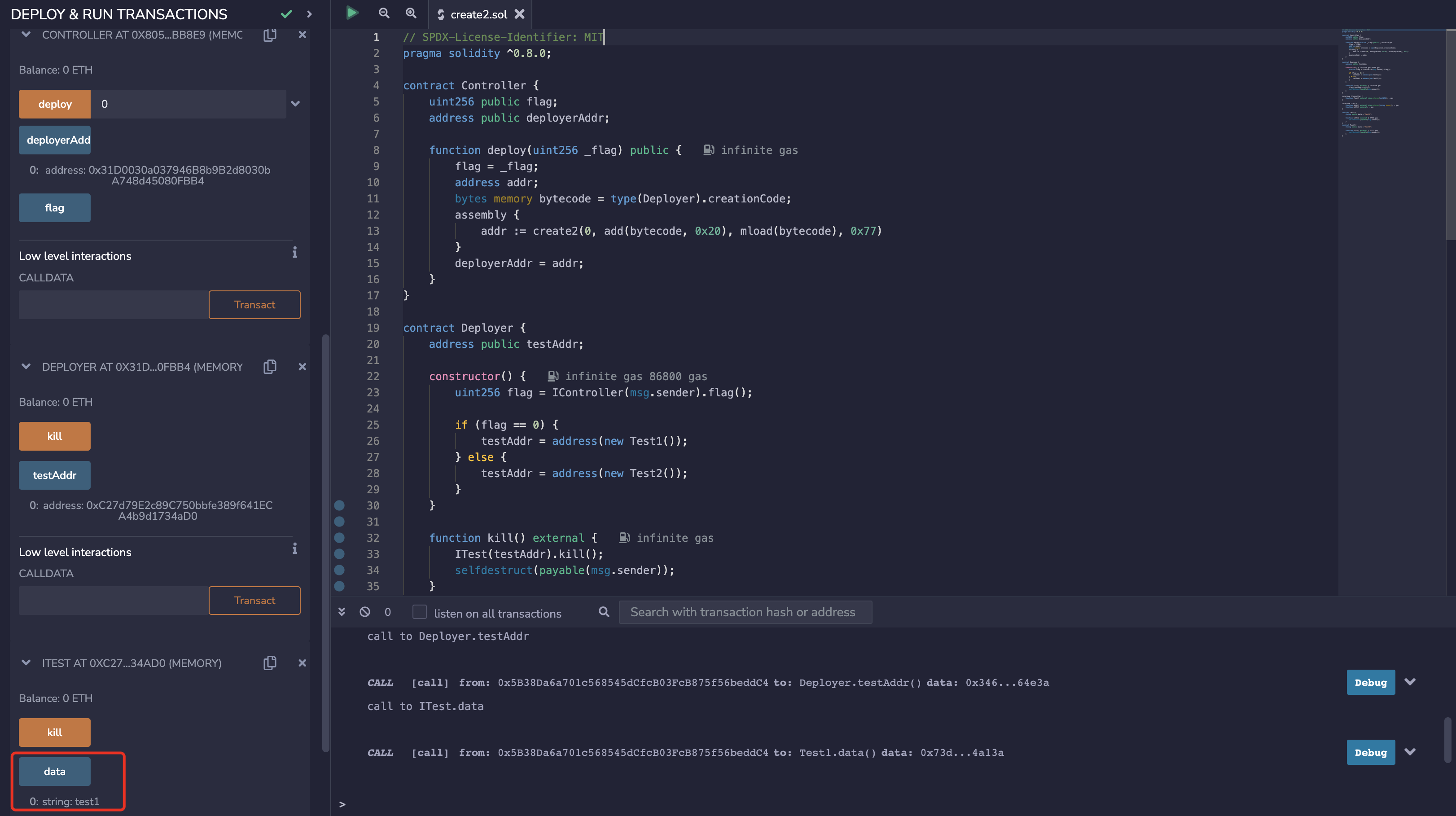 部署 Controller 合约,调用 deploy(0),最终创建的合约为 Test1
