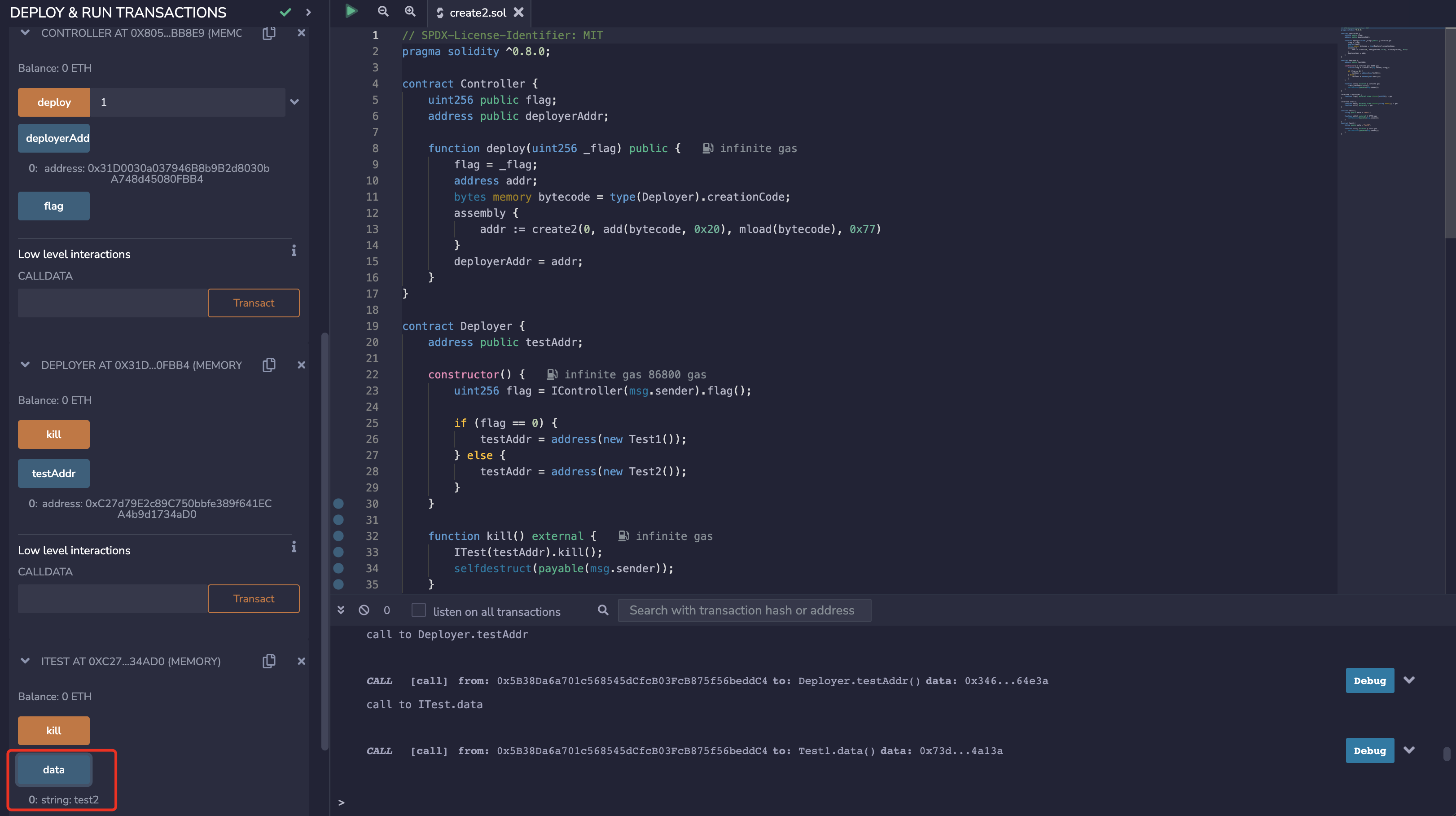 调用 Deployer 合约的 kill 函数后,再次调用 deploy(1),可以看到相同合约地址上已经重新部署为 Test2